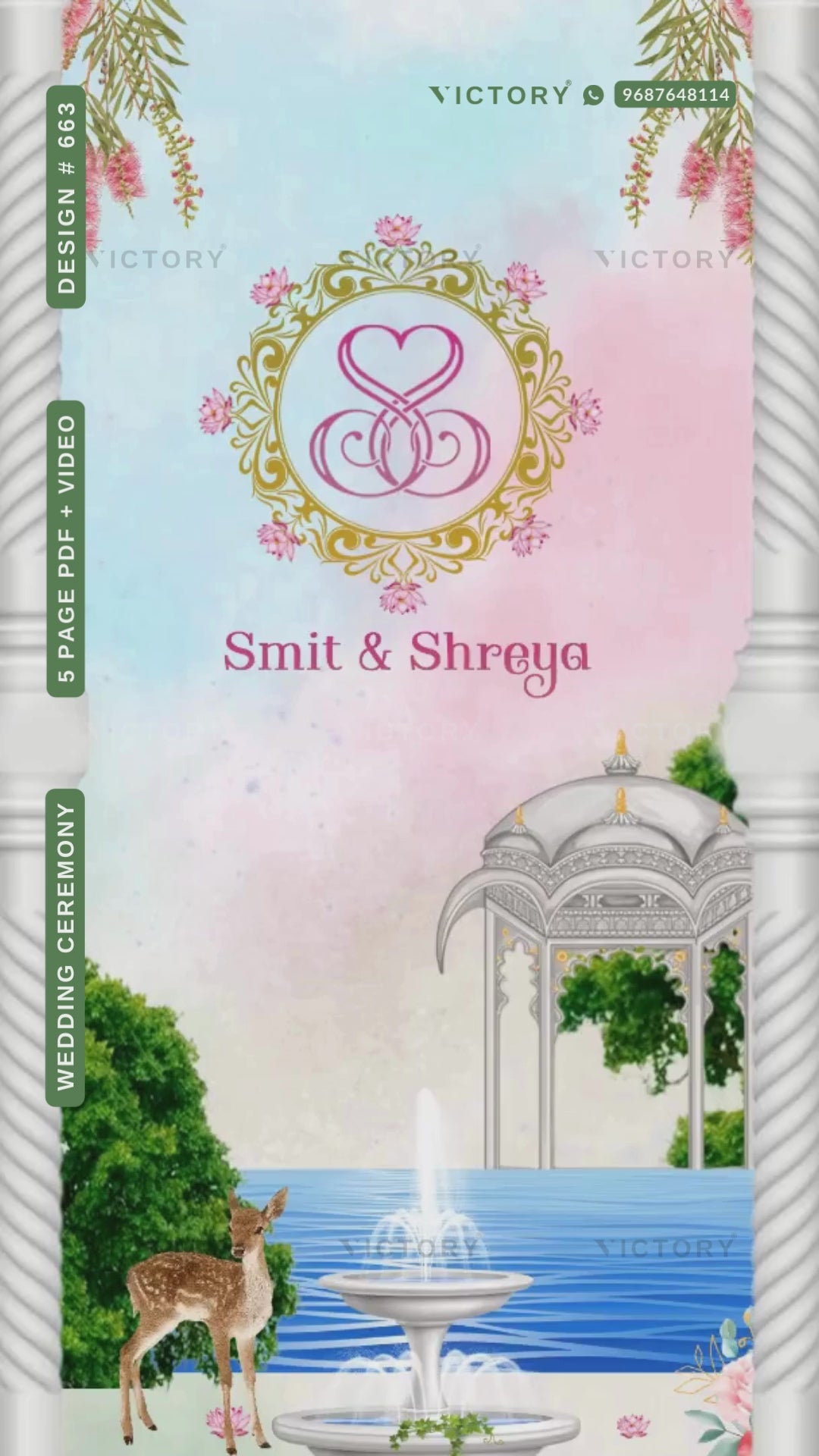 The garden Theme of the Hindu Rajasthani digital invitation card for a wedding ceremony in pink splash, purple splash, and yellow splash background color. This e-invite card is perfectly suitable for the royal family and it's available in English language. It includes elements such as a couple logo, fountain, temple arch, pink leaves, pillars, deer, Ganesha logo, fence, and peacock.