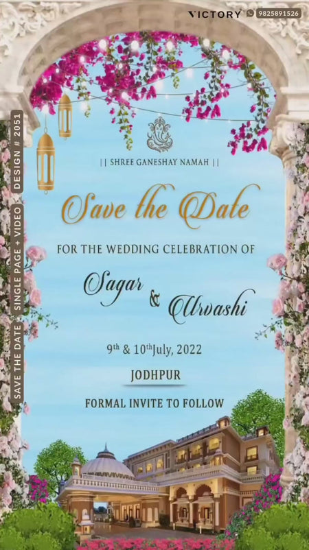 The traditional arch Theme of the Hindu Rajasthani digital invitation card for a wedding ceremony in sky blue background color. This e-invite card is perfectly suitable for the royal family and it's available in English language. It includes elements such as pink flowers, a lantern, the Ganesha logo, string lights, traditional gate.