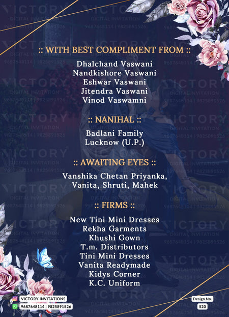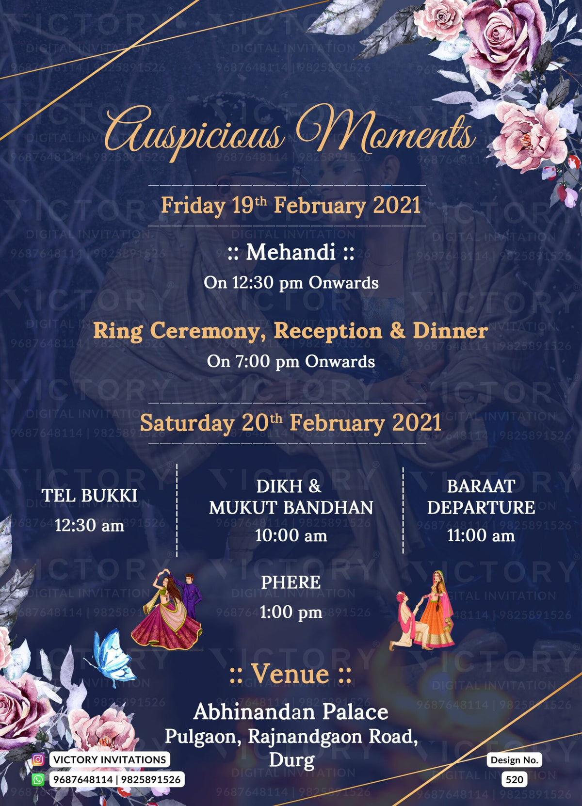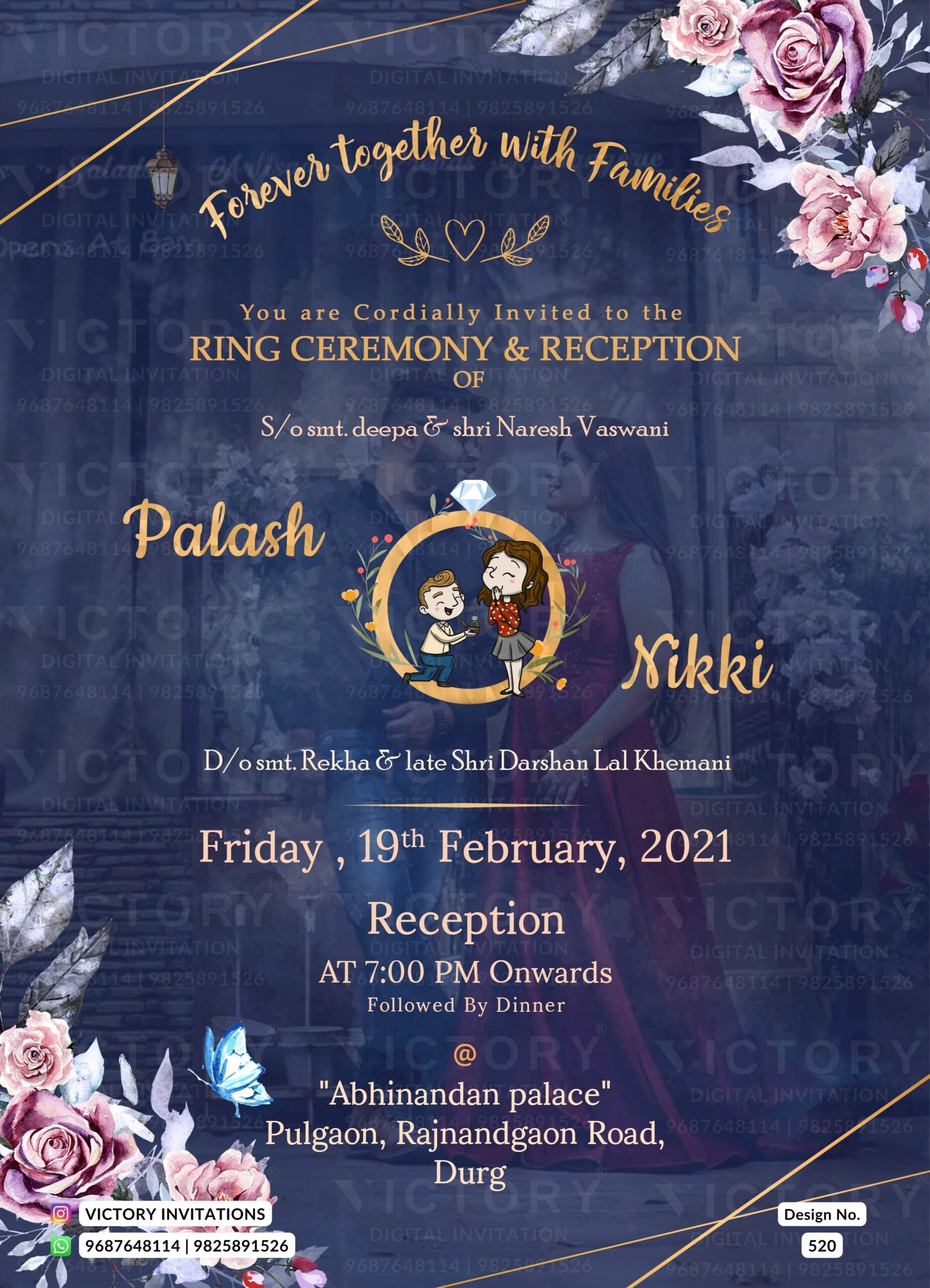 The couple photo floral Theme of the Hindu digital invitation card for a wedding ceremony in navy blue background color. This e-invite card is perfectly suitable for the Sindhi family and it's available in the English language. It includes elements such as a couple logo, pink flowers, golden lines, a couple photo, a butterfly, a couple doodle, diamond ring.