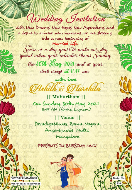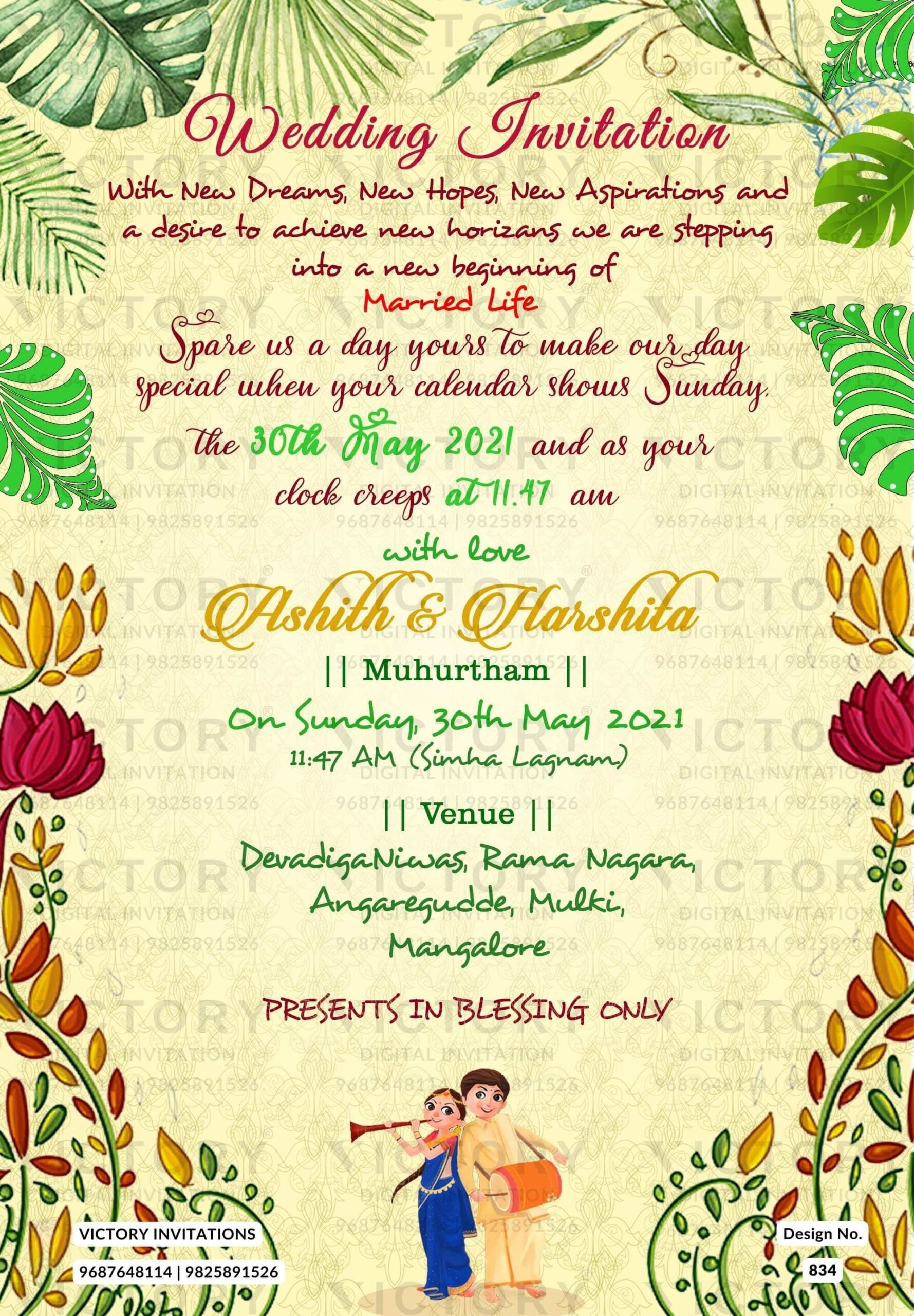 Wedding ceremony invitation card of hindu south indian kannada family in english language with artistic leaves theme design 834