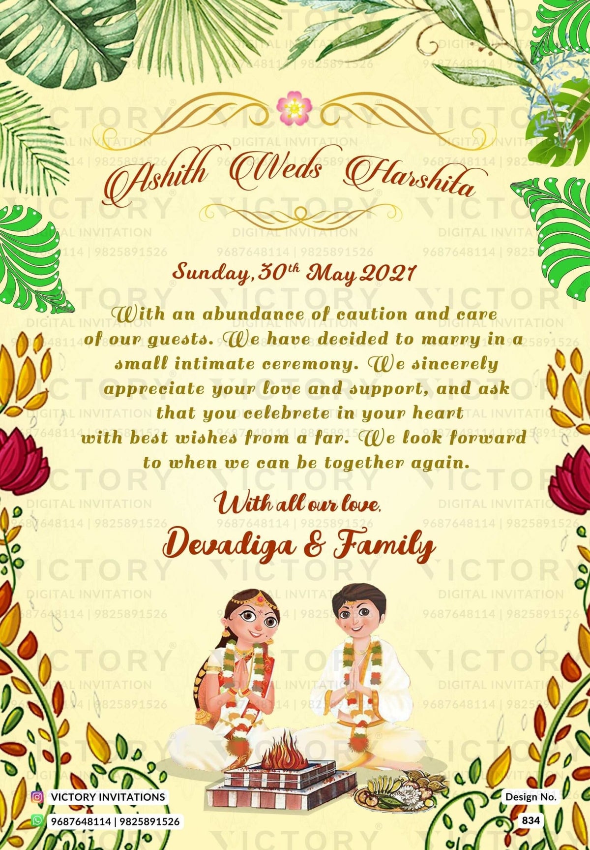 The artistic leaves Theme of the Hindu south indian digital invitation card for a wedding ceremony in the yellow background color. This e-invite card is perfectly suitable for the kannada family and it's available in English language. It includes elements such as Bengali couple doodle, red flowers, green leaves, and pink flowers.