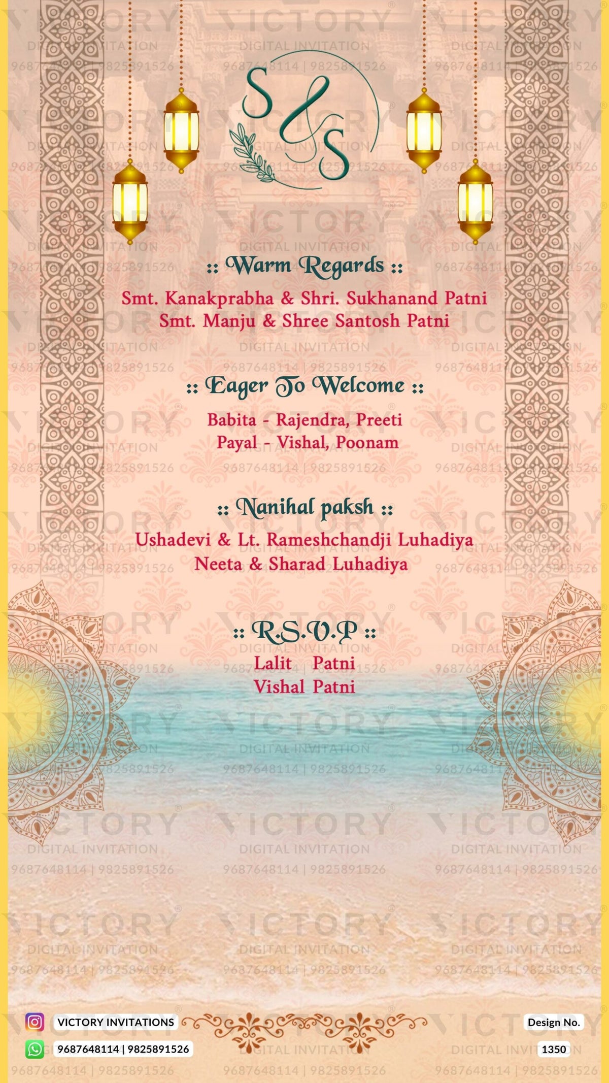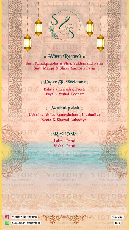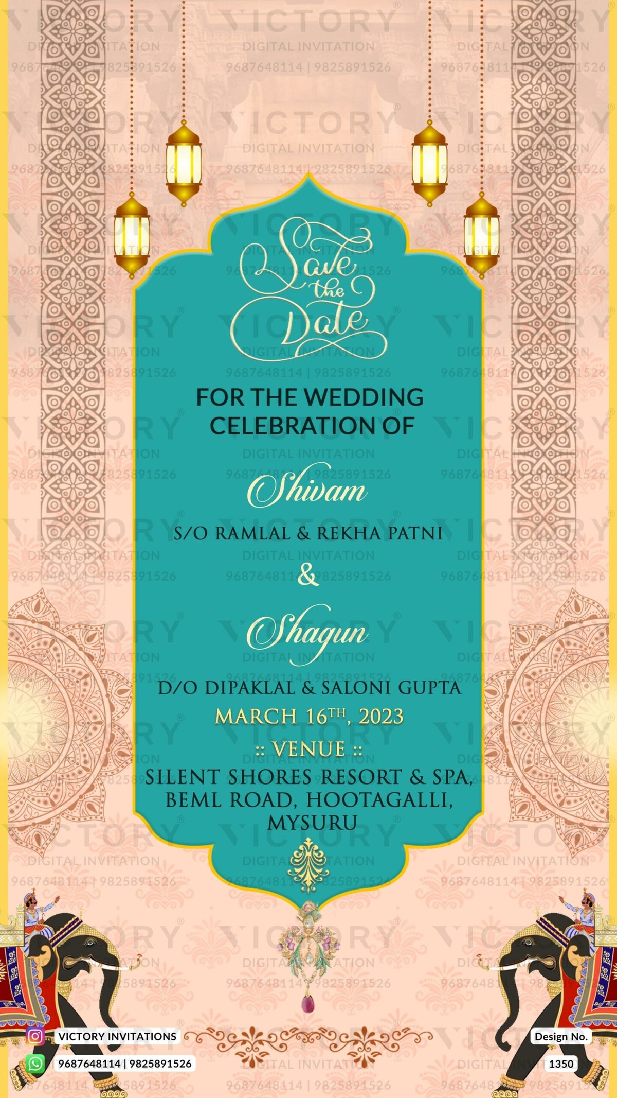 The traditional Theme of the Hindu south indian digital invitation card for a wedding ceremony is a pink background color. This e-invite card is perfectly suitable for the kannada family and it's available in English language. It includes elements such as a lantern, couple logo, mandala, elephants, and beach.