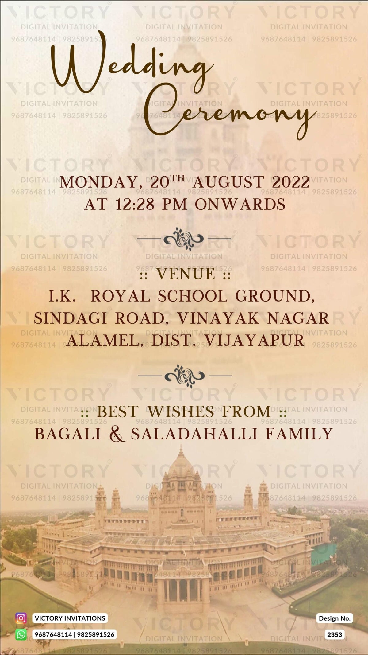 The two state Theme of the Hindu south indian digital invitation card for a wedding ceremony is in the brown background color. This e-invite card is perfectly suitable for the kannada family and it's available in English language. It includes elements such as an Indian map, red flowers, palace image.