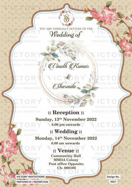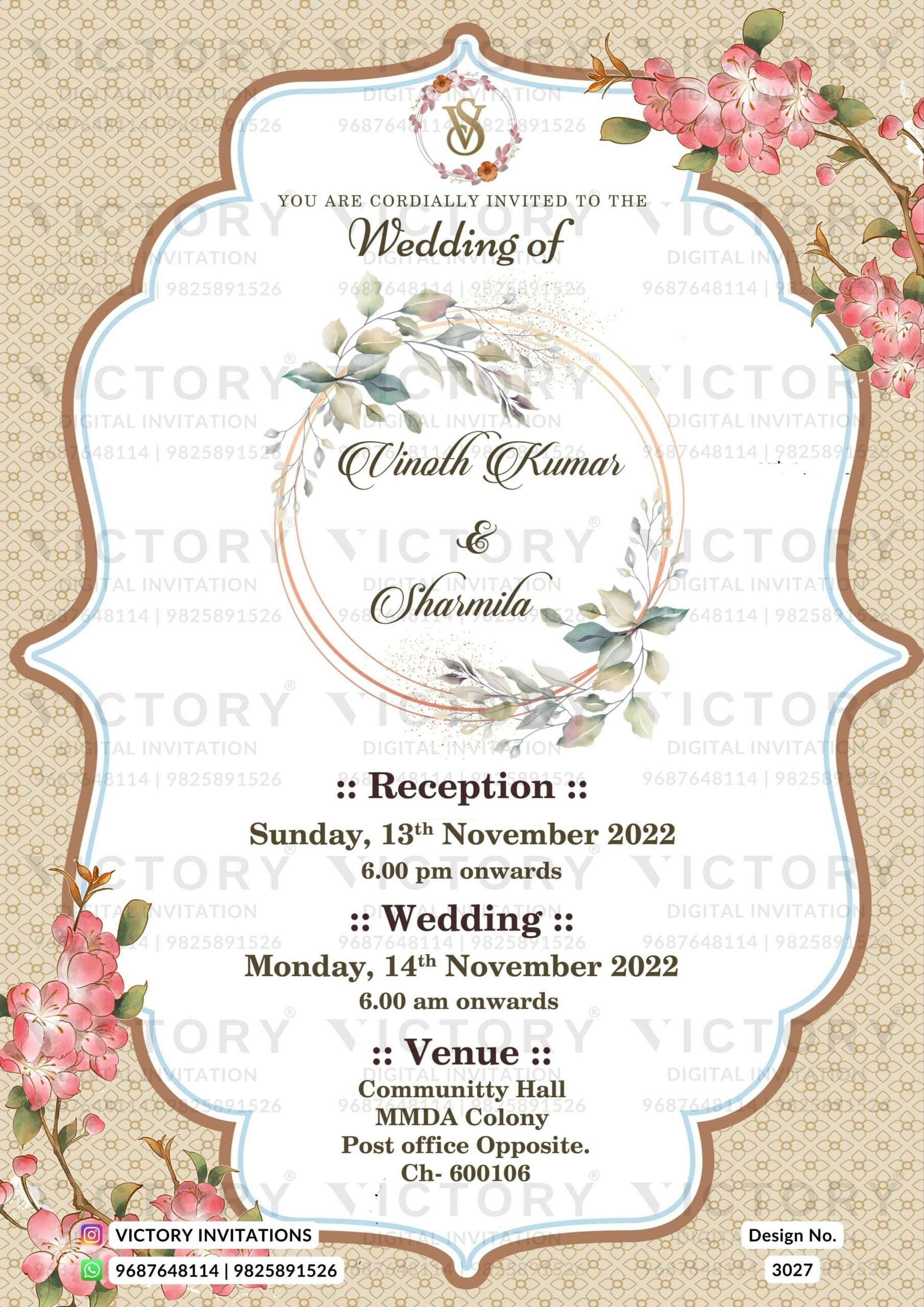 The arch Theme of the Hindu south indian digital invitation card for a wedding ceremony is in the white, brown background color. This e-invite card is perfectly suitable for a Tamil family and it's available in the English language. It includes elements such as couple logo, pink flowers, green leaves, a golden frame, and flower patterns.