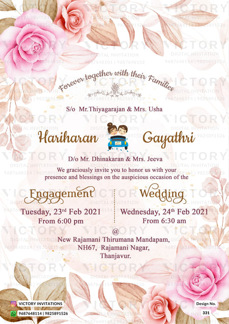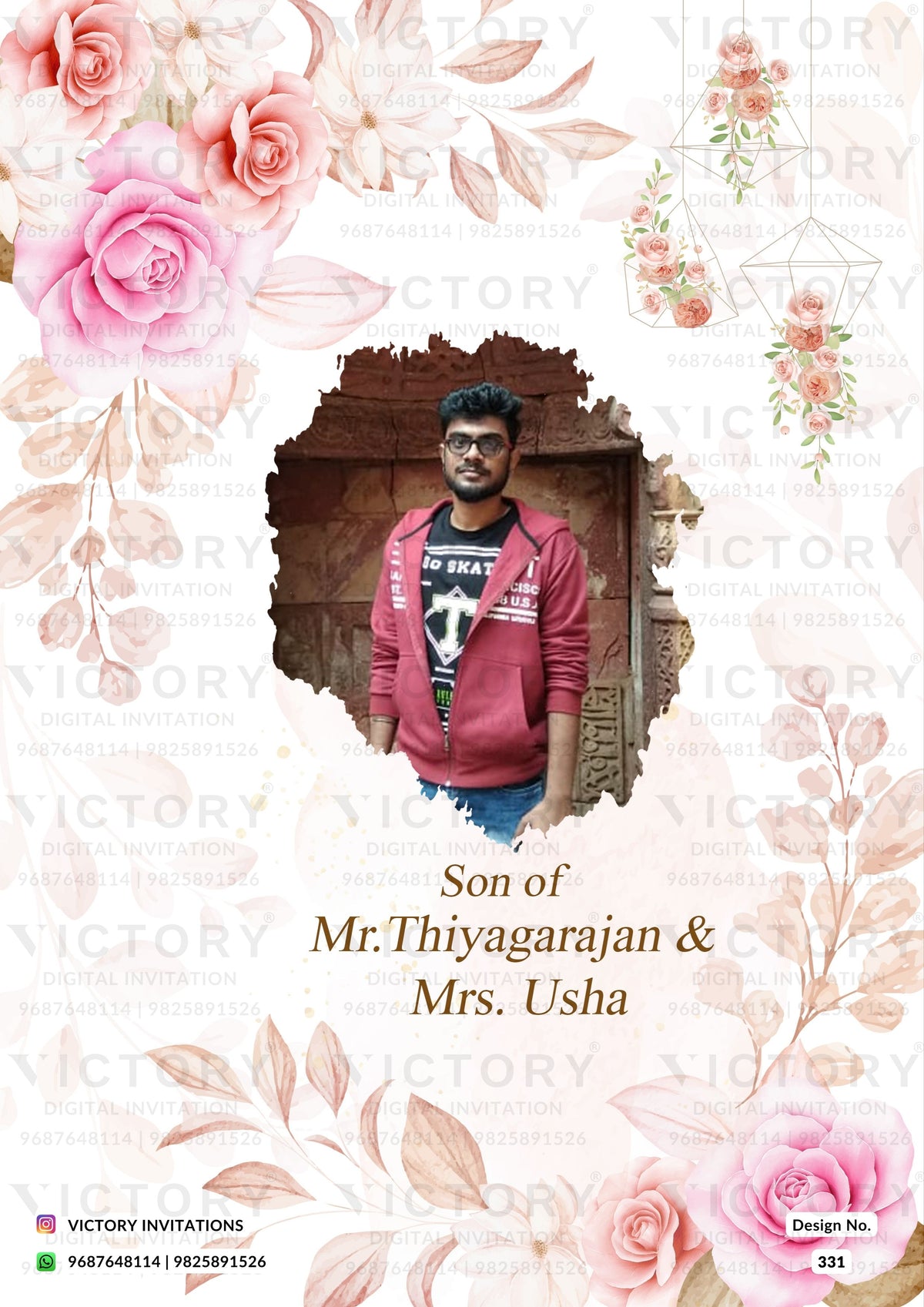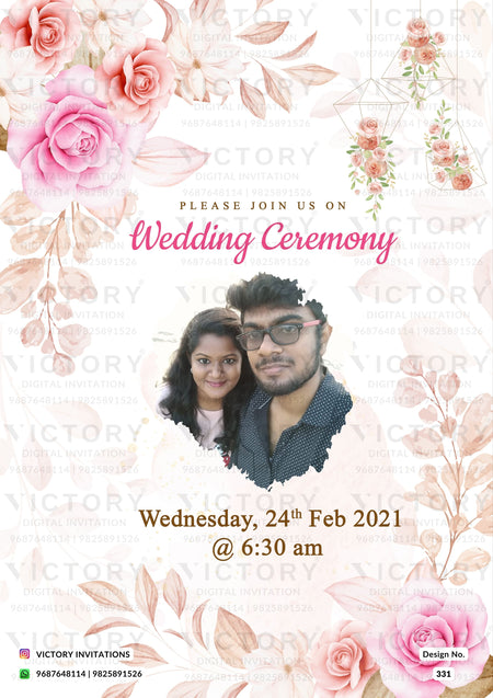 Wedding ceremony invitation card of hindu south indian tamil family in English language with couple photo floral theme design 331