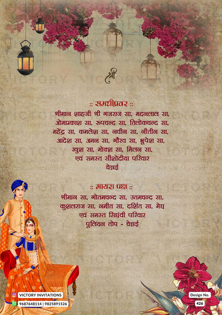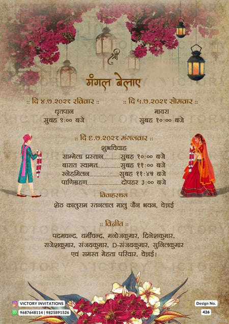 Wedding ceremony invitation card of hindu south indian tamil family in hindi language with artistic floral theme design 426