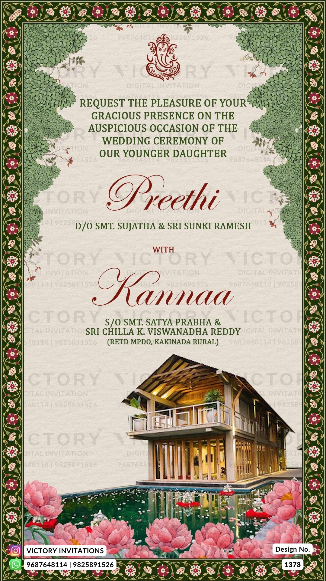 Wedding ceremony invitation card of hindu south indian telugu family in English language with Traditional theme design 1378