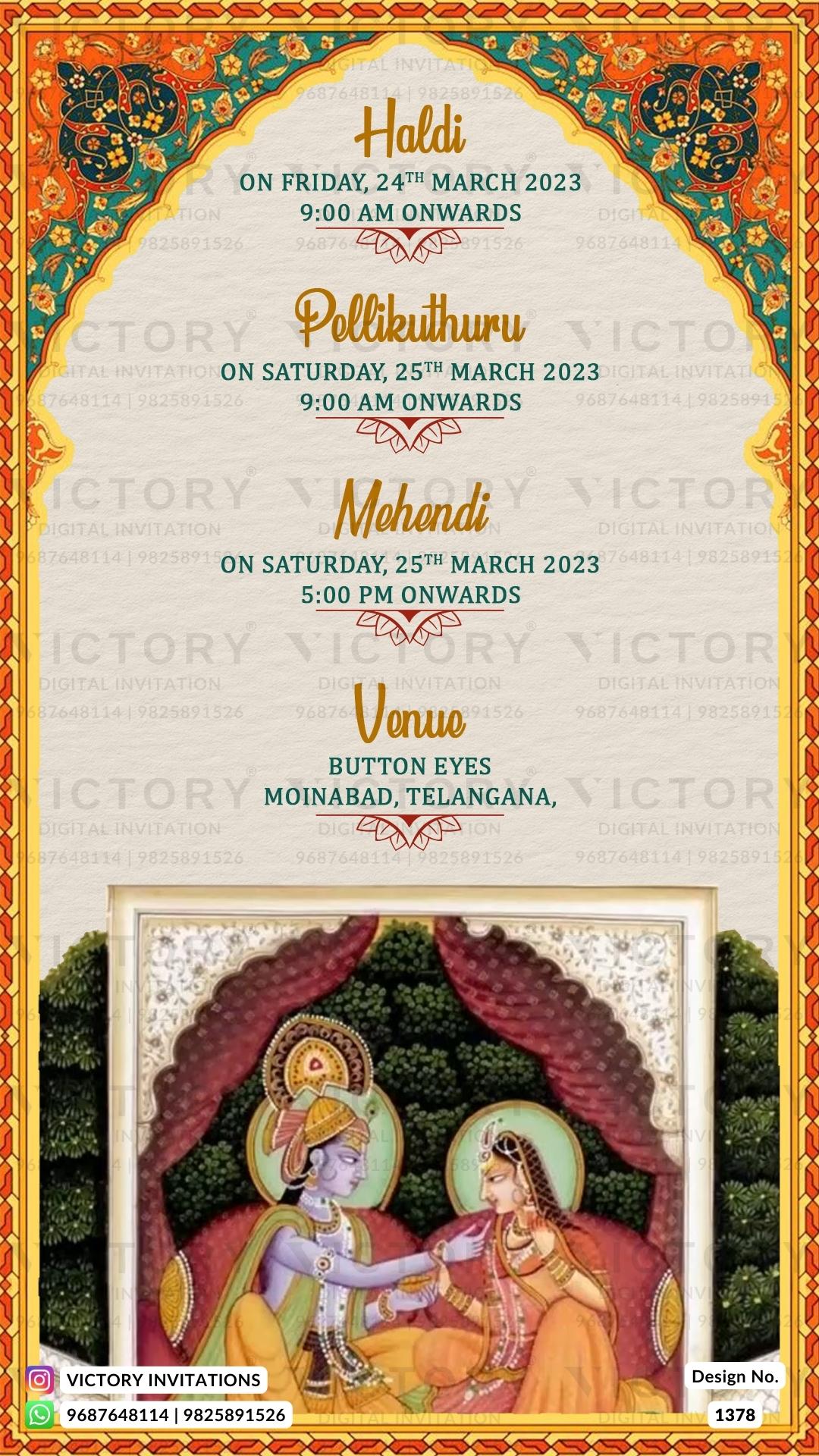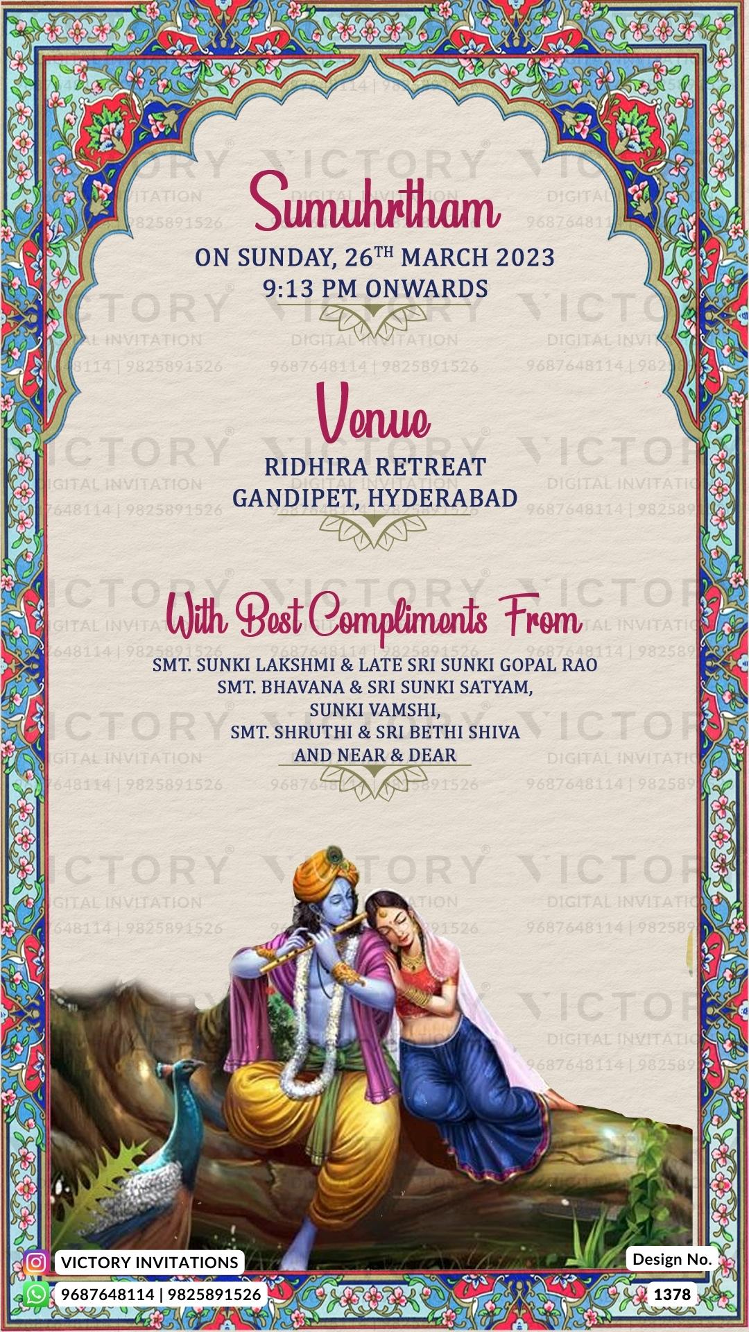 The Traditional Theme of the Hindu south indian digital invitation card for a wedding ceremony is a light yellow background color. This e-invite card is perfectly suitable for the telugu family and it's available in English language. It includes elements such as a couple logo, Radha Krishna image, brown gate, fence, grass, pink flowers, Ganesha logo, lotus, and peacock. This digital invitation we will create in JPG/PDF format. How to order? If you want to customize this card with your content, follow the steps below. 1. Place the order on WhatsApp or a Website (Add to Cart). 2. Send your content to +91 9687648114 3. We’ll set up a WhatsApp group exclusively for you and our team, where our professional team will carry out all revisions. 4. Once everything is finalized, you’ll receive your final output JPG / PDF / mp4 via WhatsApp Documents or email. Still confused! Chat with us: 👉🏻 WhatsApp (Click Here) Note: We create invitation cards or videos as per your content, We don’t sell designs, as well as we don’t share open files / Raw files.