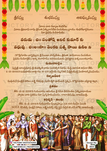 Wedding ceremony invitation card of hindu south indian telugu family in english language with traditional theme design 3015